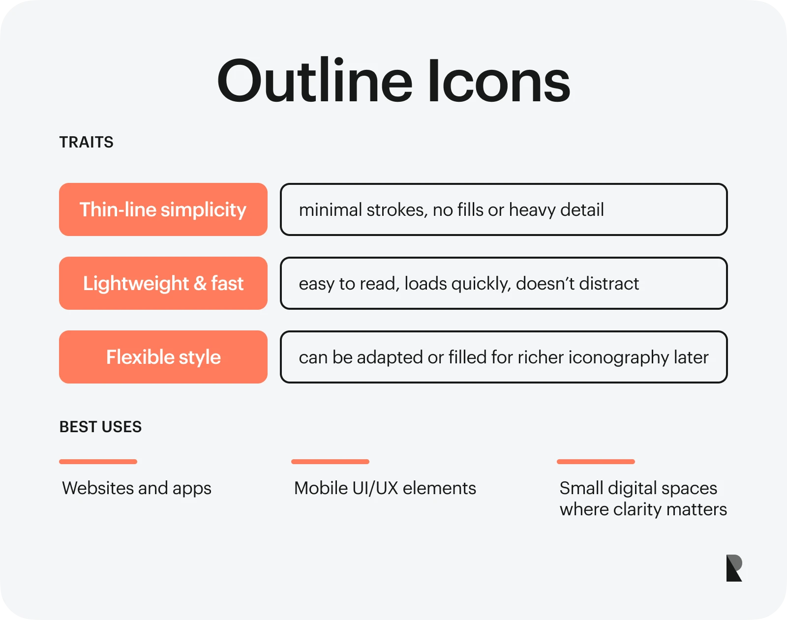 Outline icons are also flexible, as you can personalize them easily should you decide to switch to a more elaborate iconography style. Outline icons are best used for websites, apps, and other digital interfaces where space is limited and clarity is a priority.