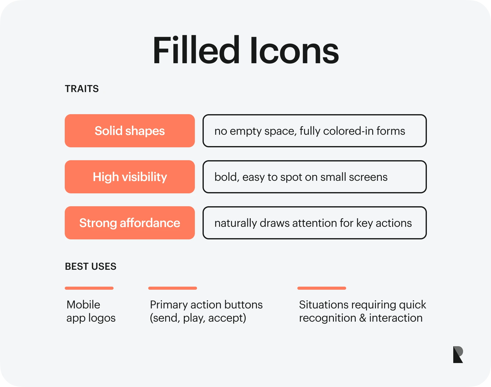 Filled icons are ideal when you want a user to decide quickly and click on an option. You can use them for necessary actions, like 'send,' 'accept,' or 'play.'