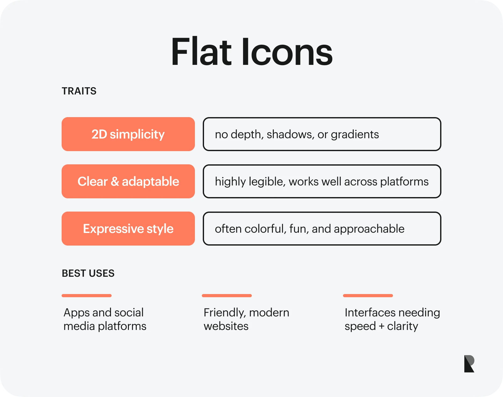 Flat icons are two-dimensional shapes and symbols without shadows or elaborate gradient colors. They offer the clarity, speed, and adaptability needed for modern and straightforward concepts.