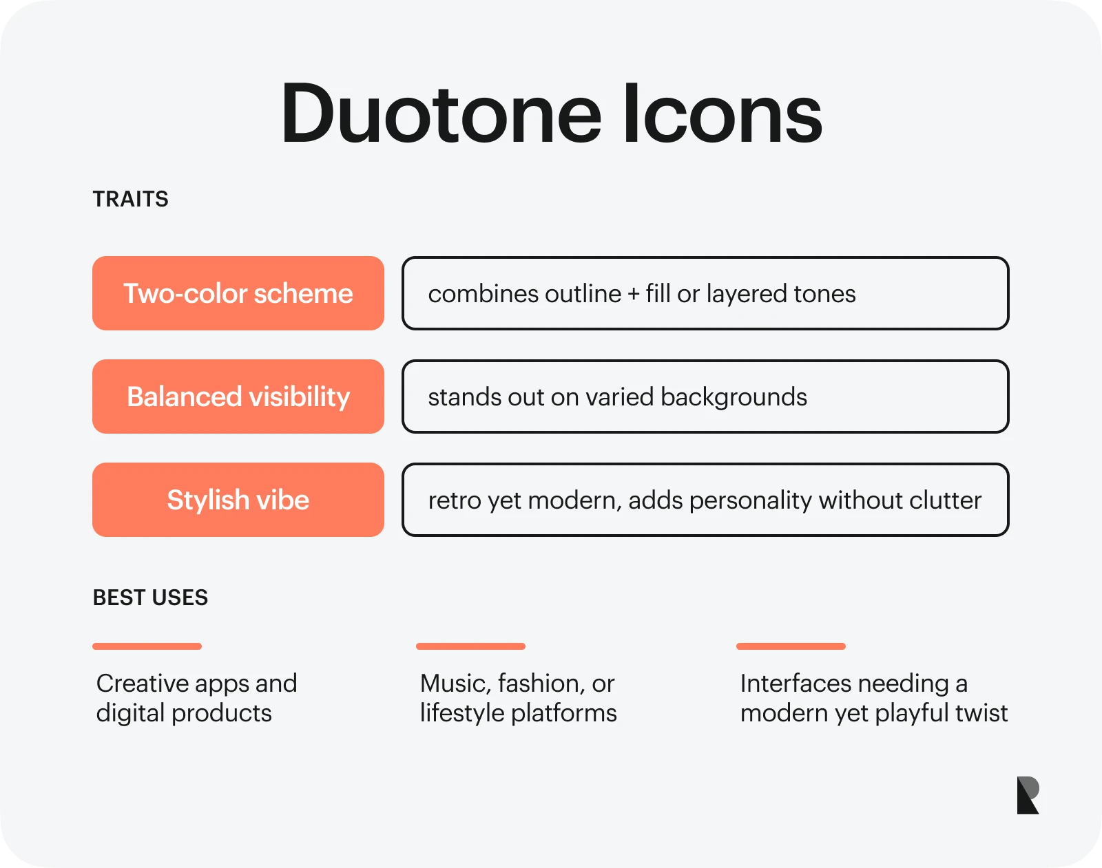 Duotone icons use two complementary colors. They are divided into two layers—for example, outline and fill—and colored differently. For instance, the outline will be lighter, while the filling will be bolder.