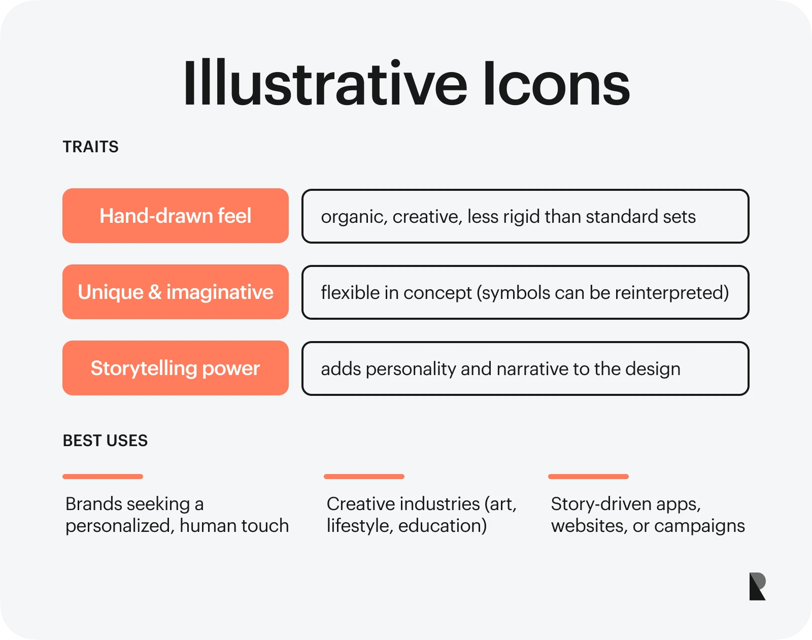 Illustrative icons allow you to stretch your imagination and be creative, enabling you to create unique designs. For instance, instead of a trash bin icon, a designer can create a hand-drawn broom, a trash bag, or a dump truck to symbolize 'delete.' Illustrative icons also allow for compelling storytelling.